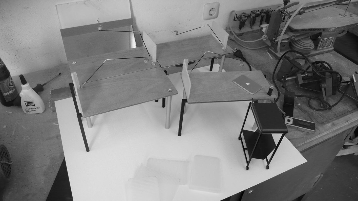 The main idea of the concept IS to save one leg by arranging the tables alongside.
