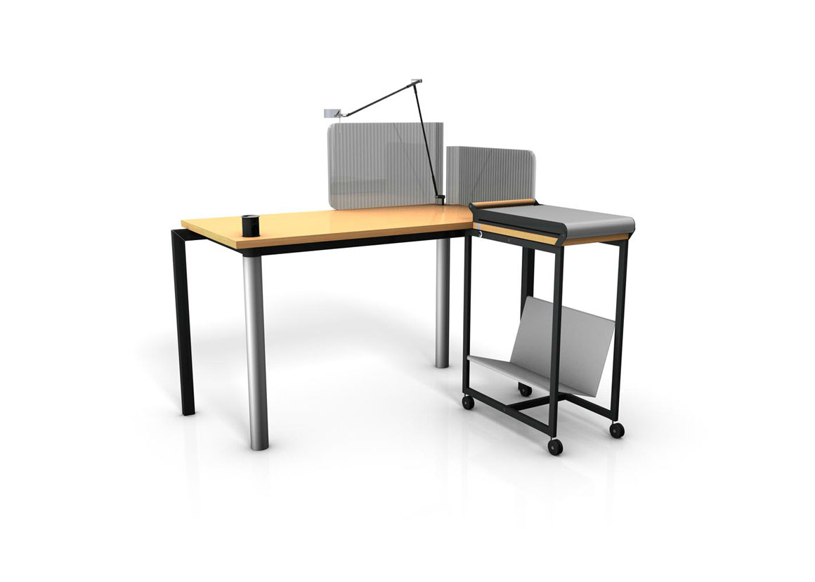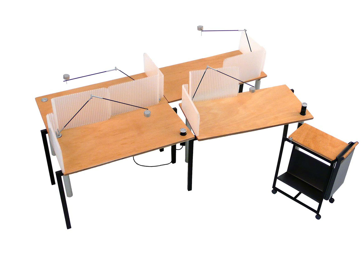 A library carrel with personal locker, lighting and a trolley to transport books.